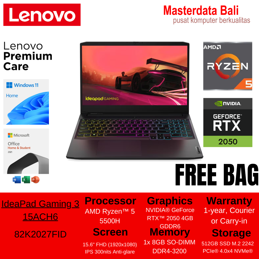 Laptop Lenovo GAMING 3-15ACH6 (82K2027FID) SHADOW BLACK : AMD RYZEN 5-5500H,8GB DDR4-3200,512GB SSD,RTX2050-4GB,15.6″FHD IPS 300NITS,WIN 11 HOME+OHS 2021,2 YEAR PREMIUM CARE+ADP (BACKPACK)