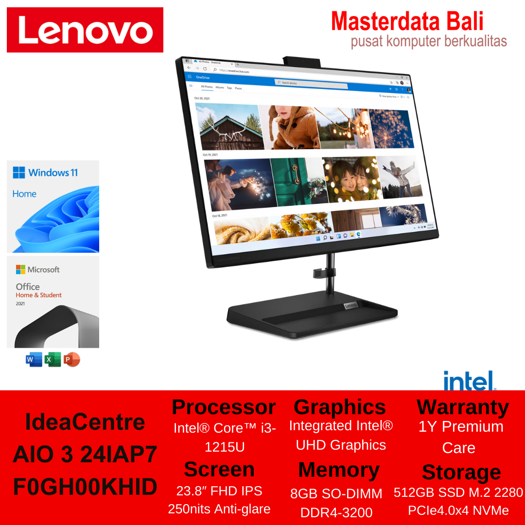 PC LENOVO AIO 3-24IAP7 (F0GH00KHID) BLACK : INTEL CORE I3-1215U,8GB,512GB SSD,23.8″,WIN 11 + OHS